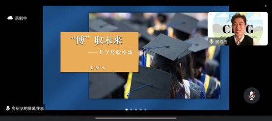 2022届硕士毕业生房绍丞,现在是中国社会科学院大学在读博士生,研究方向为现代汉语语法和互动语言学。他此次分享的主题为:“博”取未来——升学经验交流。他分别从博士生找工作的难易程度、申博何时开始准备最好、如何确定导师或院校等方面进行讲述,着重说明了报考阶段的注意事项与策略等。最后,还分享了博士生面试经验。