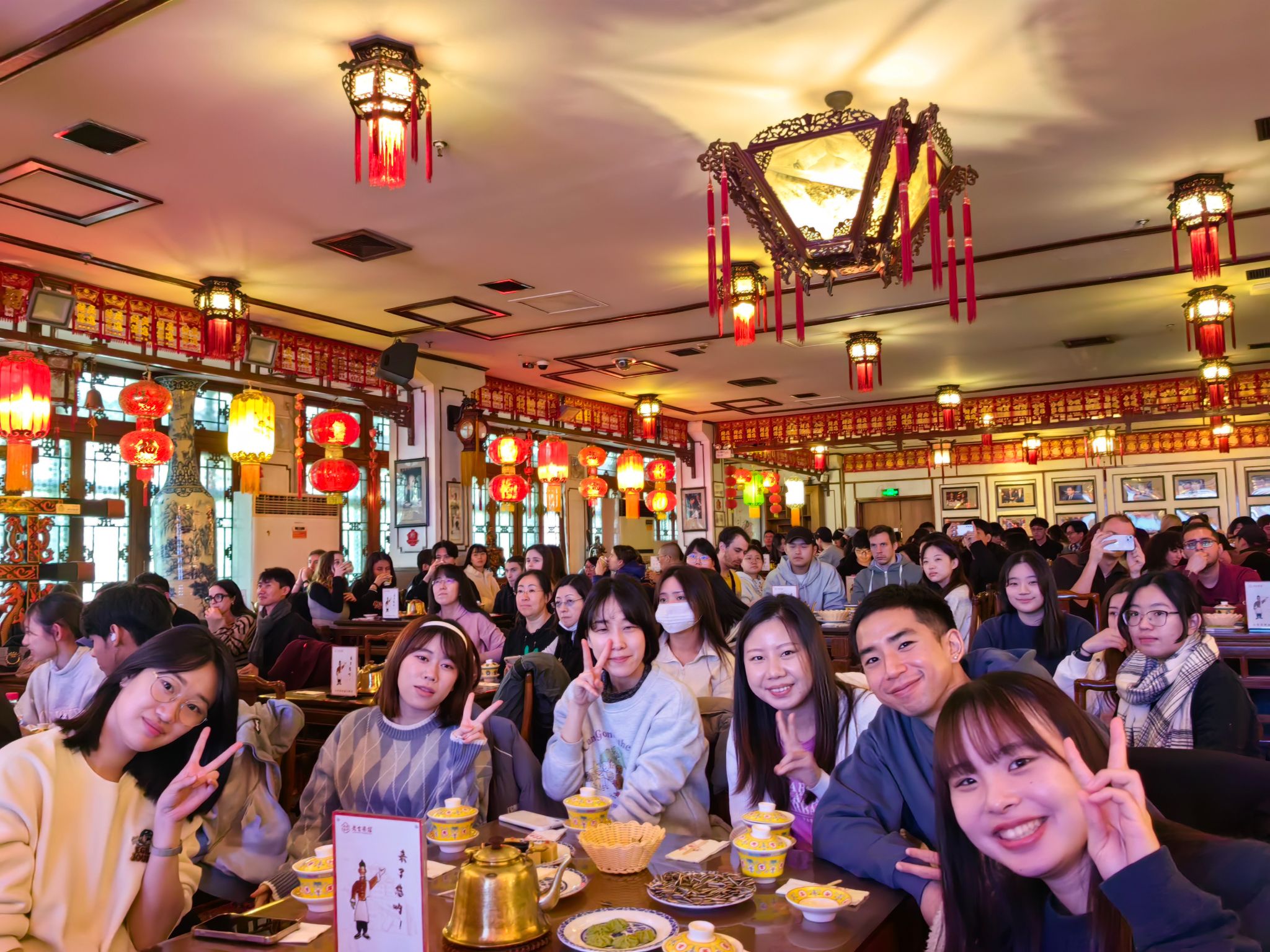 走进老舍茶馆的大门,同学们立即就被传统韵味十足的环境吸引住了。大大的灯笼兔爷、脚下的木质楼梯、顶上的华丽宫灯,令同学们惊叹不已,对接下来的演出充满期待。