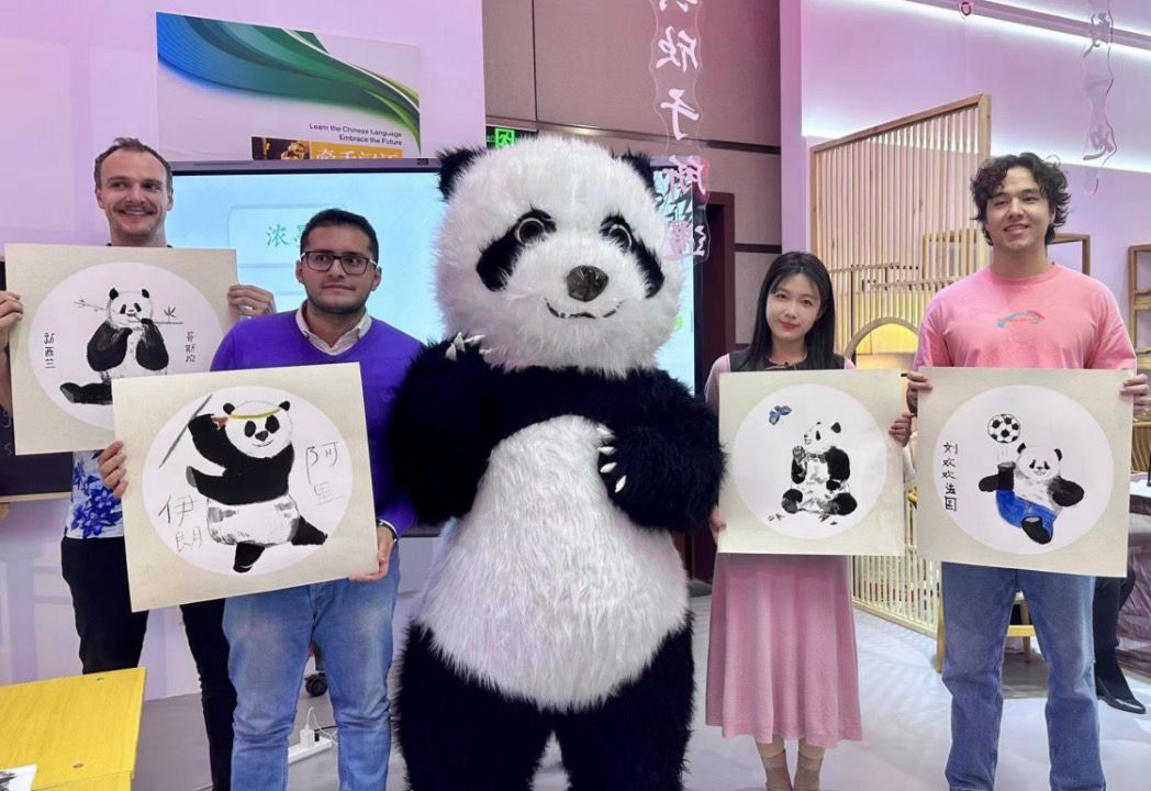 的于璐老师现场教授了留学生如何用毛笔描绘熊猫,展现了中国绘画艺术的独特魅力。学生们融入个人创意,画出了憨态可掬的“西直门三太子”萌兰的可爱形象,并兴高采烈地向陈杰副部长展示自己的作品。