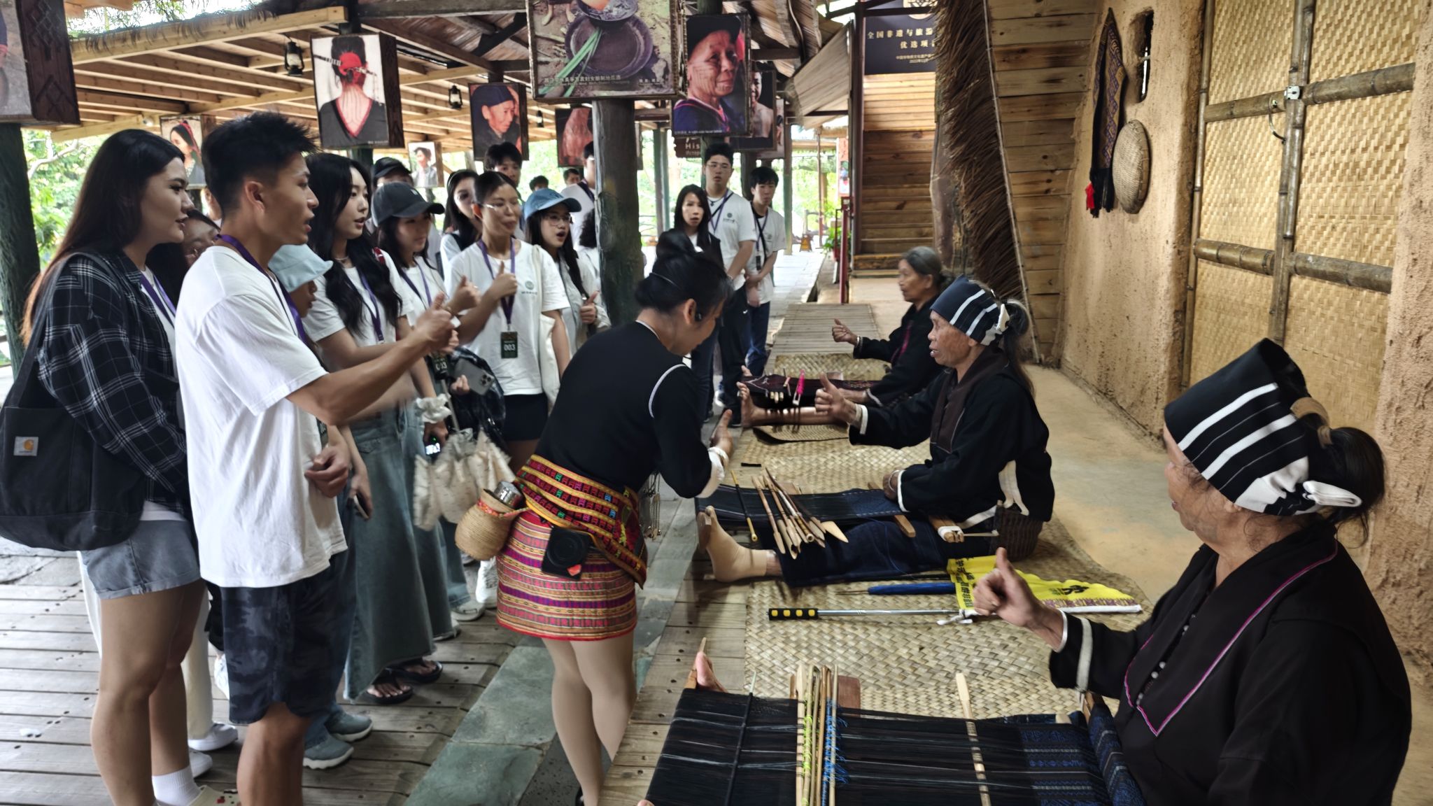在槟榔谷黎寨,同学们与黎族阿哥阿姐热情交流,学习黎苗文化的历史传承和风俗习惯,了解中国的民族大团结政策,欣赏黎族传统纺染织绣等非物质文化遗产技艺,也真切体验到过去处于穷乡僻壤的黎寨通过乡村振兴政策走上了特色发展的富裕幸福之路。看到几位年过八旬的黎族老奶奶依然巧手翻飞、忙织黎锦的场面,同学们赞叹不已。随后亲身体验火辣辣的黎族药膏,品尝黎家美食簸箕餐,更是让同学们感受到中国少数民族文化的独特魅力。