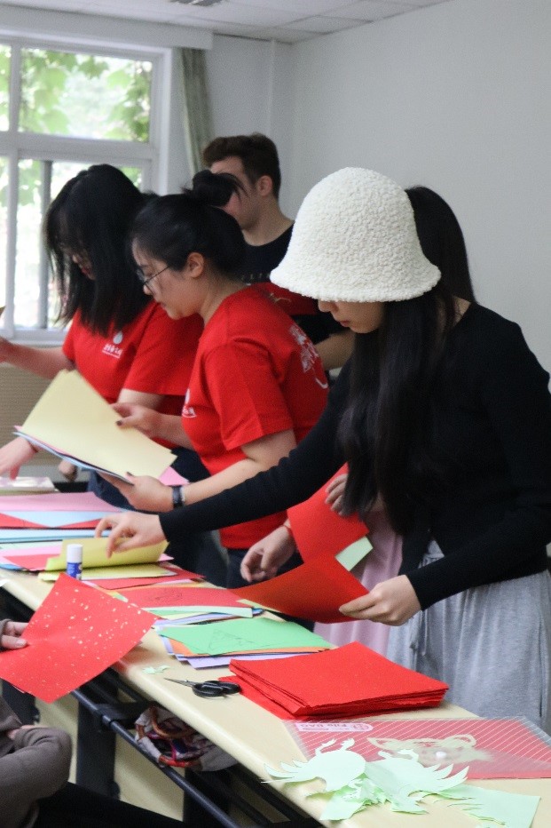 第一场“假日文化教室”活动安排在了10月6日上午。当天,我和小伙伴们早早就到达了活动现场,大家按照之前的分工有条不紊地开始了工作。有的负责板报的设计和绘制,有的将上课所需的各种材料搬运到教室摆放好,有的调试电脑设备,有的再次确认参加活动的学生名单,提前做好签到准备。大家默契的配合使得活动顺利地拉开了序幕。我们协助主讲老师开展教学活动,为国际学生提供帮助,如分发材料、指导剪纸、纠正读音等。在“朗诵与唱歌”活动中,郭子超同学还发挥了自己唱歌的特长,协助老师教学生们唱中国歌曲,赢得了同学们的阵阵喝彩。我和卢思淼、卢泽萍、张菊萍等4人组成的新闻小组,则注意收集素材,记录了很多难忘的瞬间。整个“假日文化教室”活动气氛热烈活跃,虽然我们都忙得不亦乐乎,但留学生们对中国文化的热爱,对我们的友善,主讲老师们生动有趣、深入浅出的教学方法都让我们深深地沉浸在喜悦和收获之中。