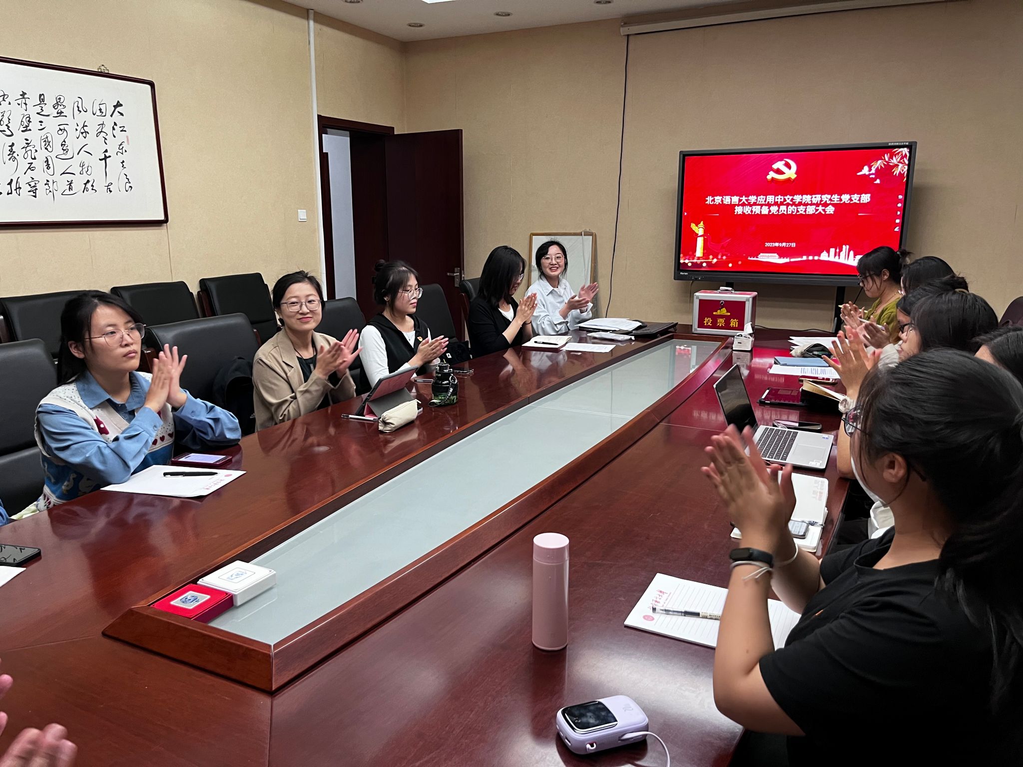 按照《中国共产党发展党员工作细则》等相关规定要求,支部书记黄灿依次主持了武玉君、赵婕两位同学的发展接收程序。她首先介绍了基本情况;接着,由发展对象本人汇报个人情况,对党的认识、入党动机、个人履历、家庭主要社会关系情况进行了详细的说明;然后,第一入党介绍人黄灿和第二入党介绍人焦宇倩同志就发展对象的情况发表意见。接着,组织委员牛世超代表支委会对其审查情况进行说明;随后,与会党员就发展对象能否入党展开了充分的讨论,焦宇倩、徐牧渊、罗红、朱冬静等同志皆发表个人意见,同意其入党;会议进行了严格的投票程序,经无记名投票表决,全票同意接收两位同志为预备党员。两位预备党员也表示将始终坚定信仰,为共产主义事业而奋斗终身。最后,周鑫书记结合具体情况对此次会议进行总结讲话,主要提出了三点要求和期望:一是坚持“不忘初心,牢记使命”;二是全体党员同志需加强学习:三是全体党员同志需踏实工作。会议在全体党员同志奏唱雄壮的《国际歌》中结束。