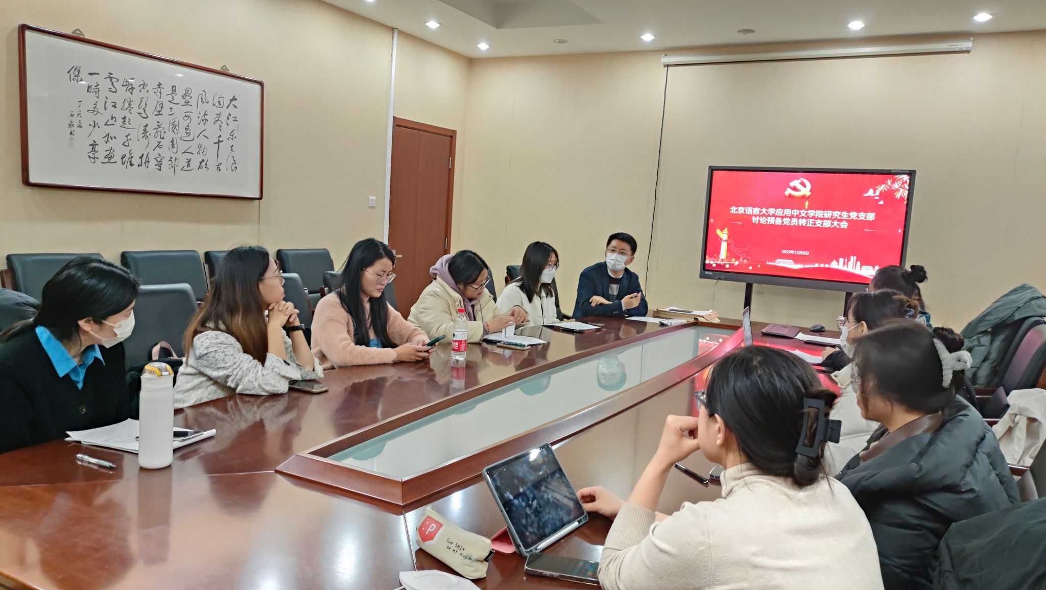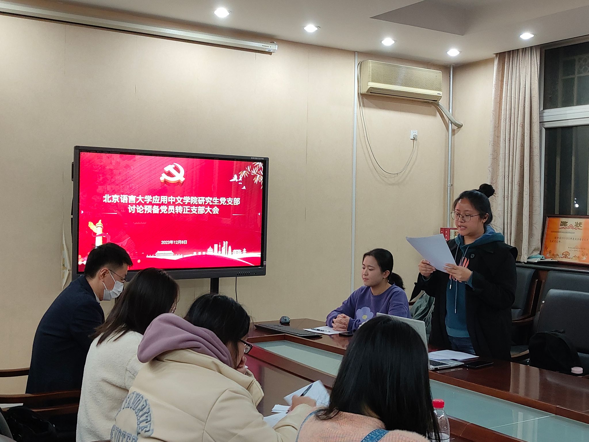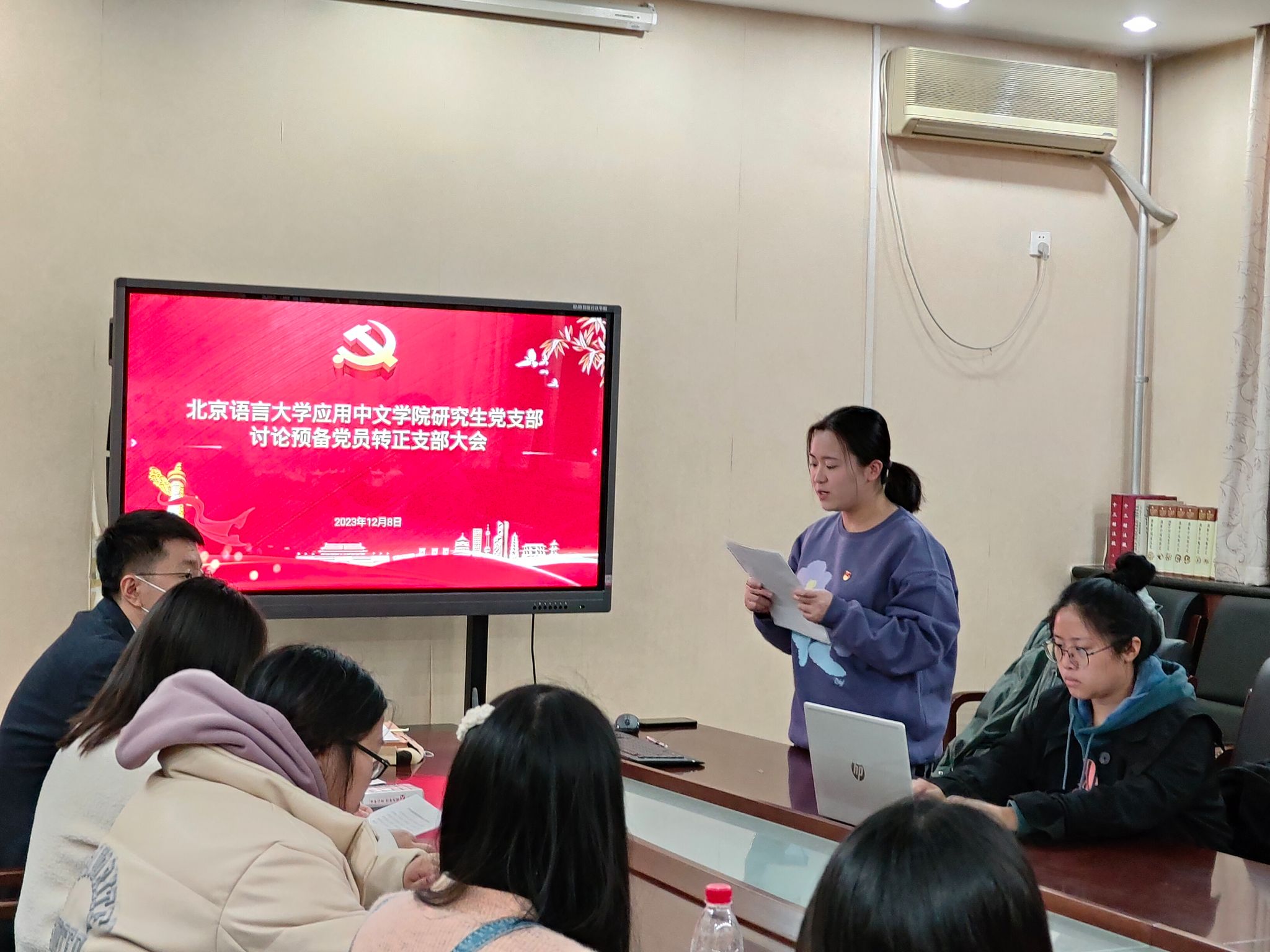 研究生党支部于2023年12月8日晚7点在教三楼124召开全体党员大会,会议主题是讨论袁中慧和朱冬静两位预备党员转正,研究生党支部全体党员参加了会议。本次会议由学院党委副书记白浩老师主持。