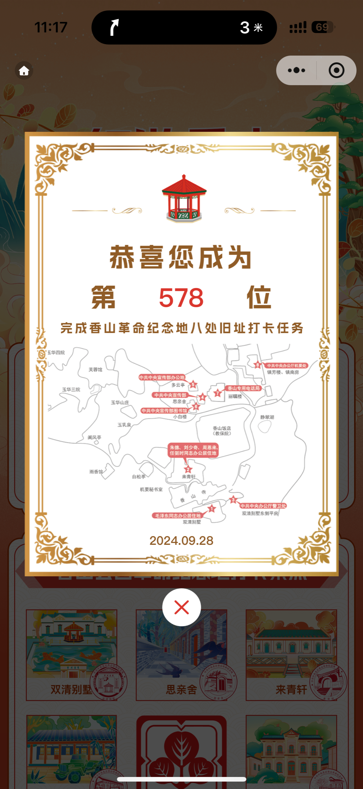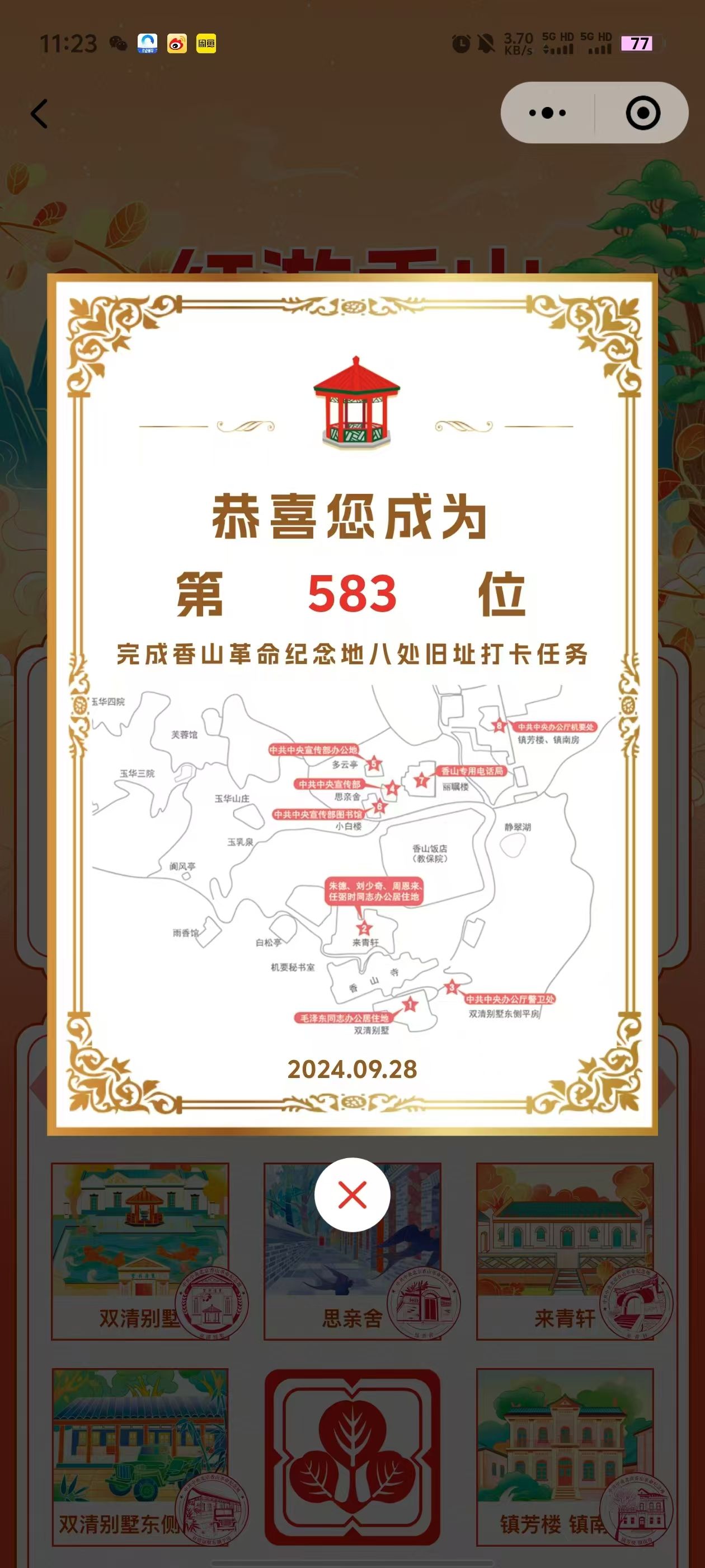 为增强团支部成员凝聚力、增加团日活动趣味性,本次主题团日活动开展了“红游香山”打卡活动。同学们在小程序上打卡八处旧址,获取证书。大家纷纷踊跃参加,最终有10名同学完成了打卡并取得了证书。