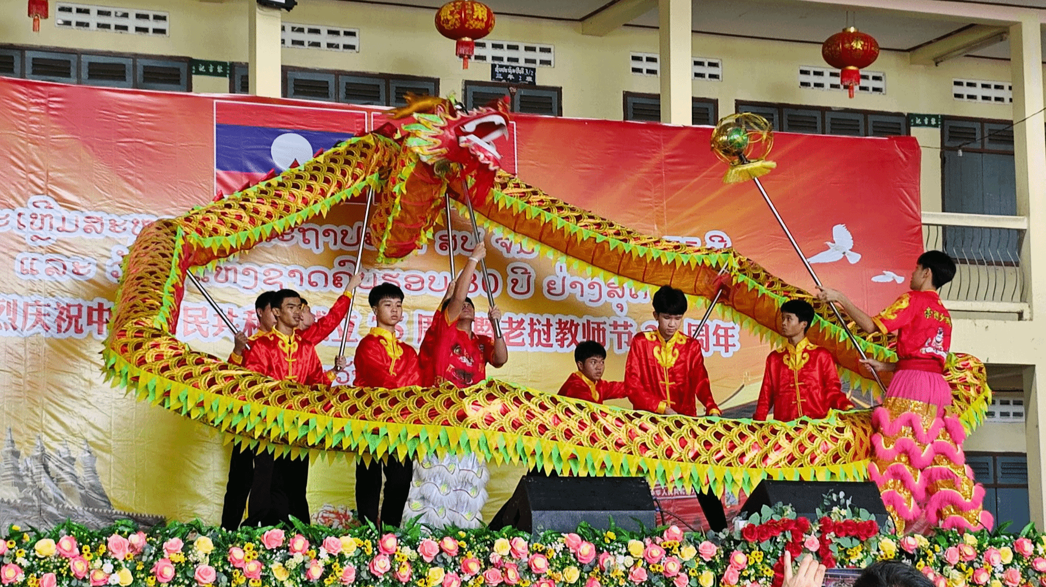 节日是文明互鉴最鲜活的载体,也是情感的自然流露。国庆节时,中国老师在老挝这片土地上放声歌唱,用歌声祝福祖国75周年快乐,而同学们排练了将近一个月的舞龙表演,他们用平日里辛苦训练的汗水和舞台上的笑颜,表达了对中国的最美好而纯真的祝愿,舞龙这一传统民俗活动,成为文化交流的生动展示,让老挝学生深入体验中国文化的独特魅力;2025年春节,学校联欢晚会的舞台上,孩子们表演大气磅礴的武术、妩媚婀娜的舞蹈,“喜迎乙巳年”的汉字与老挝文字交相辉映,中老人民都在这片喜庆祥和的氛围中交融,春节这一传统节日,因丰富的文化内涵,成为中老文化交流的纽带,让两国人民在欢乐中增进了解与友谊。