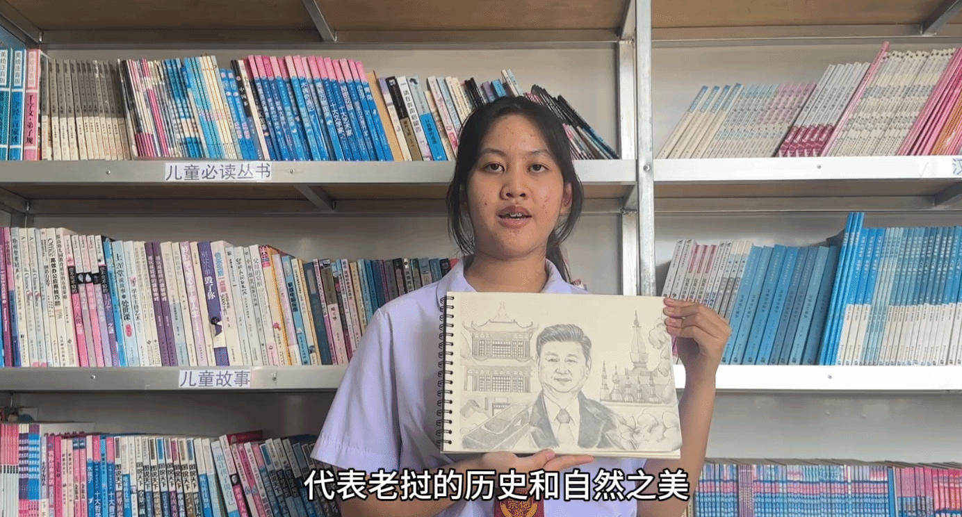 课堂是我播撒汉语种子的第一方天地,也是文化交流的肥沃土壤。站在讲台上,望着学生们好奇又认真的眼神,我深知文化的桥梁正从这里悄然搭建。在综合课上,学生们为了完成一项又一项交际活动而围着课件热烈讨论,汉语成为他们沟通思想、交流合作的工具,而这些活动背后所蕴含的中国文化的智慧与魅力,也在不知不觉中渗透进他们的心田;书法课上,王爱娟同学一笔一划临摹古诗,娟秀字迹里满是对汉字文化的敬畏与热爱,汉字的横竖撇捺间,传递着中华文化的独特韵味,学生们通过书写,感受着汉字背后深厚的文化底蕴;绘画活动中,曾美怡同学用黑色的铅笔和白色的纸,勾勒出中老两国五彩斑斓的未来,绘画成为文化交流的生动表达,学生们用画笔描绘出他们对中老友谊的憧憬与向往;诗歌朗诵时,孩子们虽然仍不太懂得“红日初升,其道大光”,可他们却在中老两国友好关系的快速发展中渐渐明白了“故今日之责任,不在他人,而全在我少年”,汉语诗歌的韵律之美与精神内涵,在他们的诵读声中得以传承与弘扬。