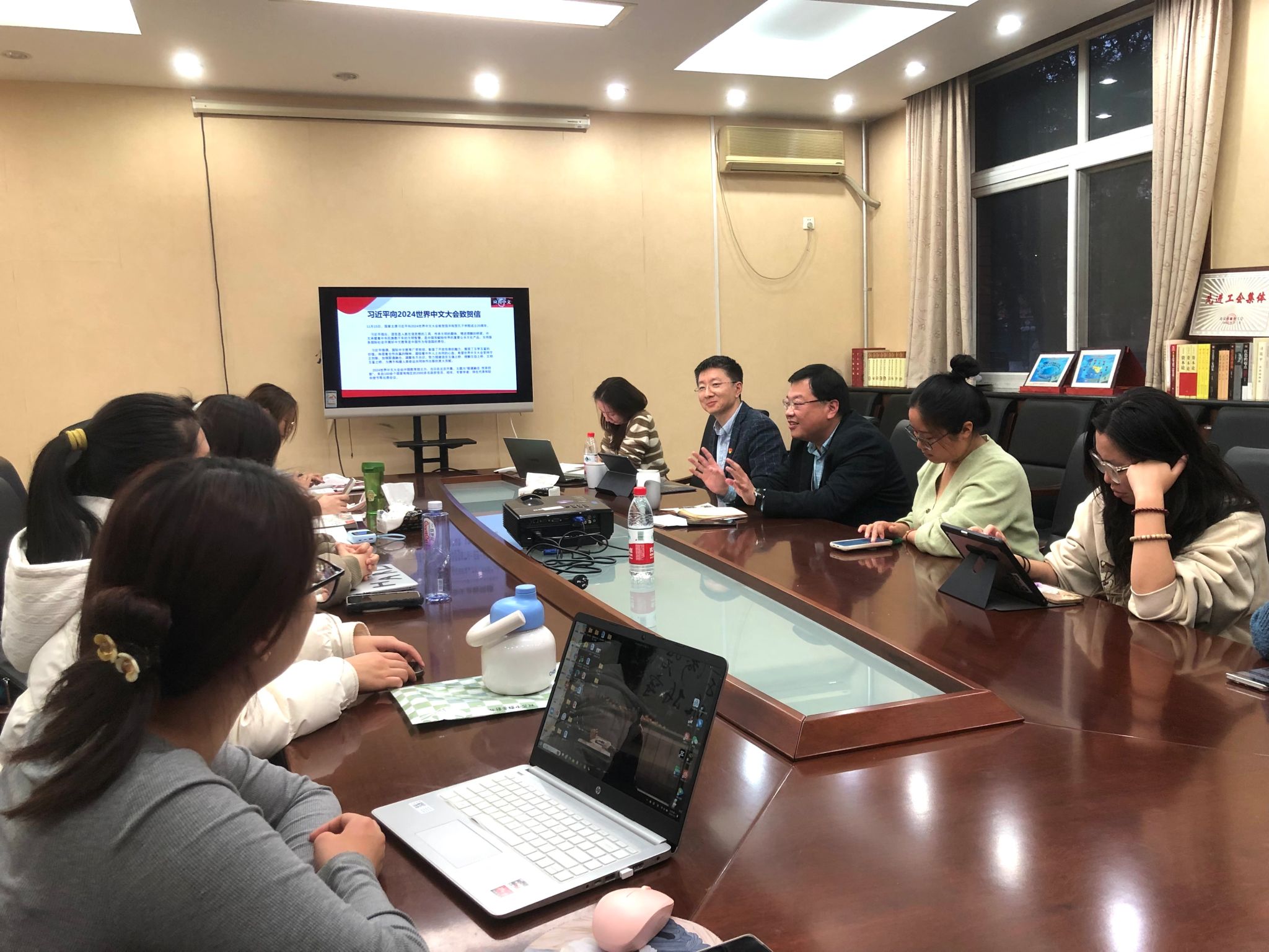 白浩副书记首先带领同学们一起研读了习近平主席的贺信内容,强调作为未来的汉语教育者,汉教研究生们肩负着传播语言和文化、展示中国形象的使命,他鼓励大家以开放的心态和创新的精神,推动中文教育走向世界,为构建人类命运共同体贡献自己的青春力量。